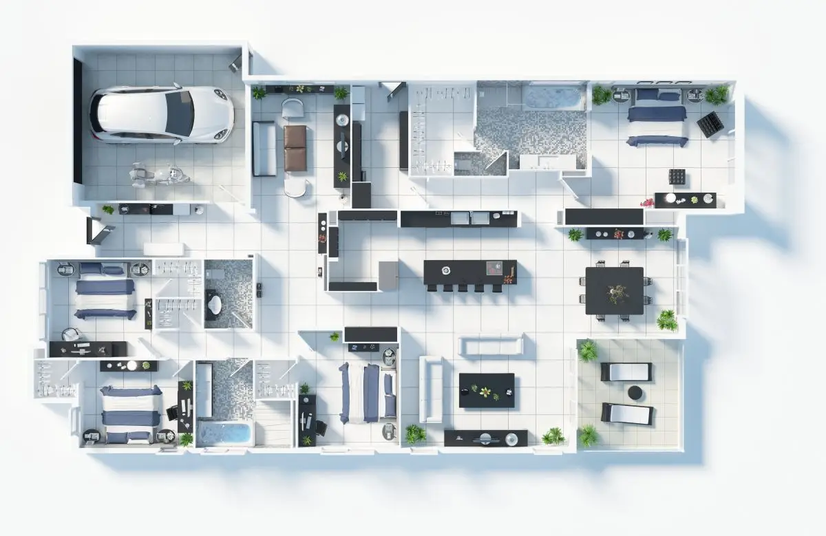 Wykonujemy rzuty 2D, rysunki techniczne wraz z uwzględnionymi wymiarami, meblami w różnych stylach i kolorystyce. Oferujemy fotorealistyczne rzuty 3D – w różnych stylach i perspektywach.
