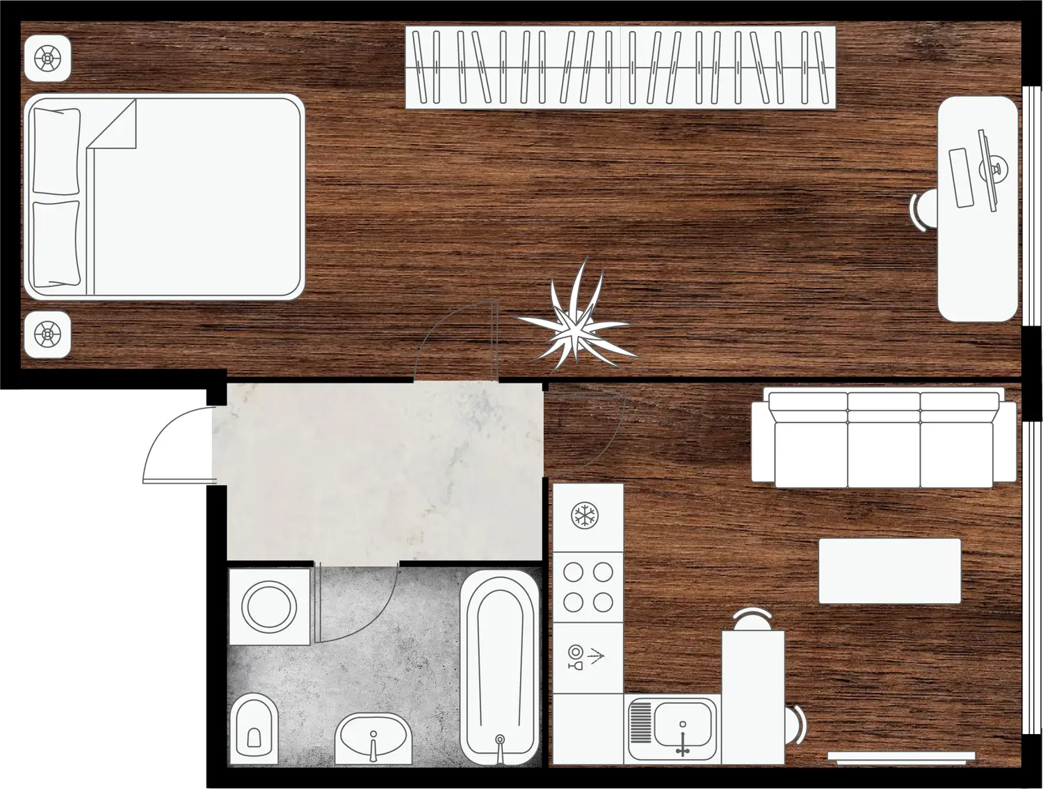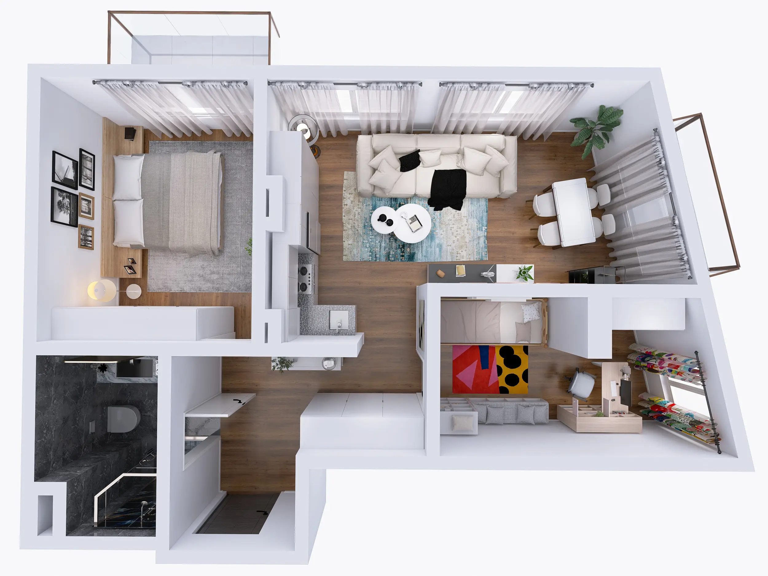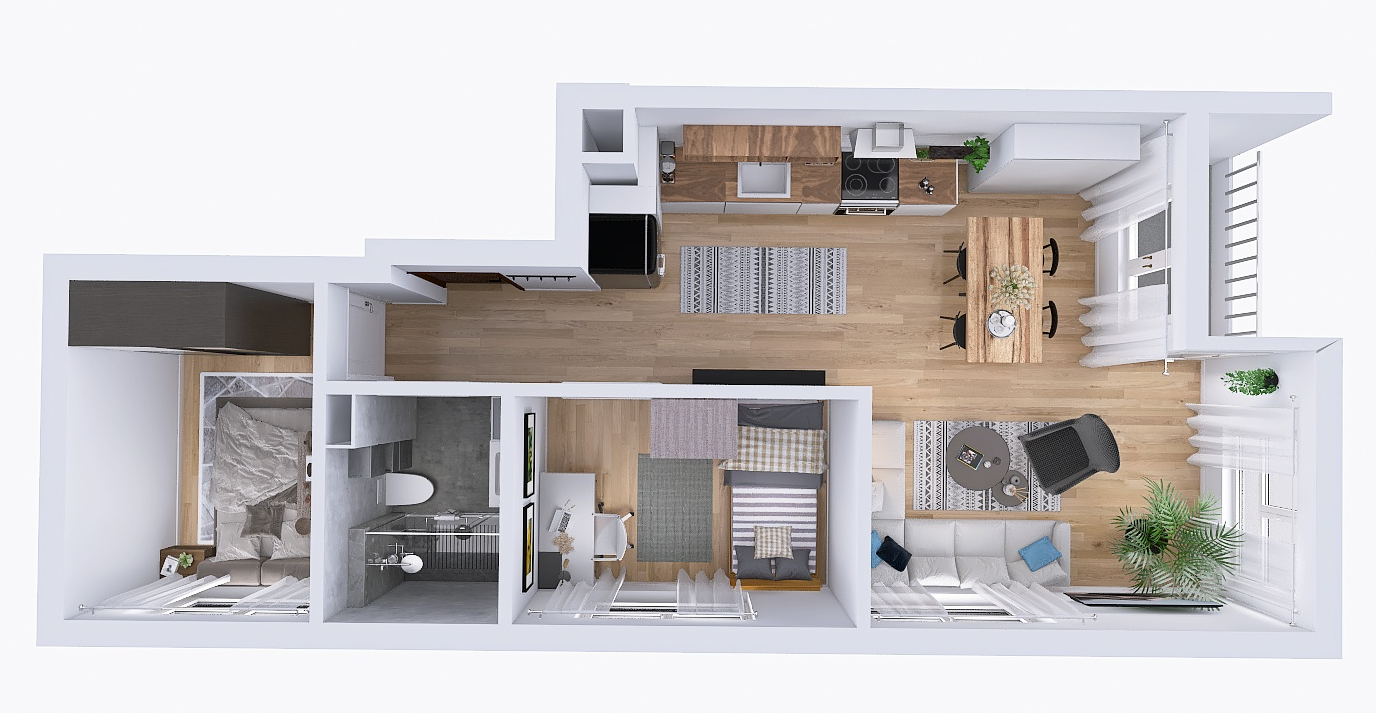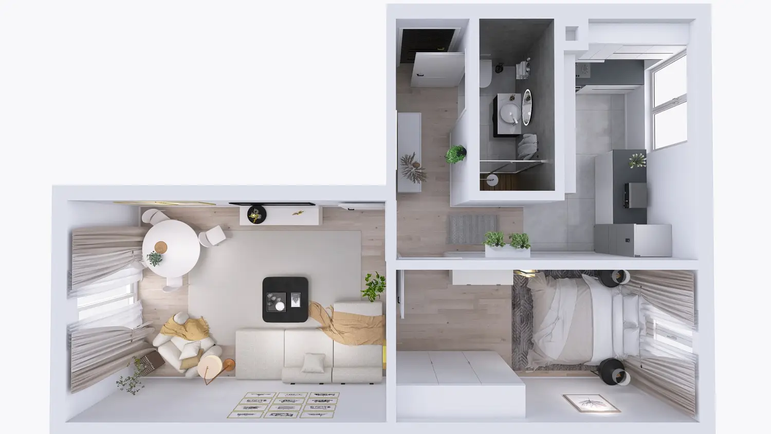Wykonujemy fotorealistyczne rzuty 3D – w różnych stylach i perspektywach. W pakiecie klient zawsze otrzymuje rzut perspektywiczny i prostopadły w jakości 4k (3840 x 2160 px).